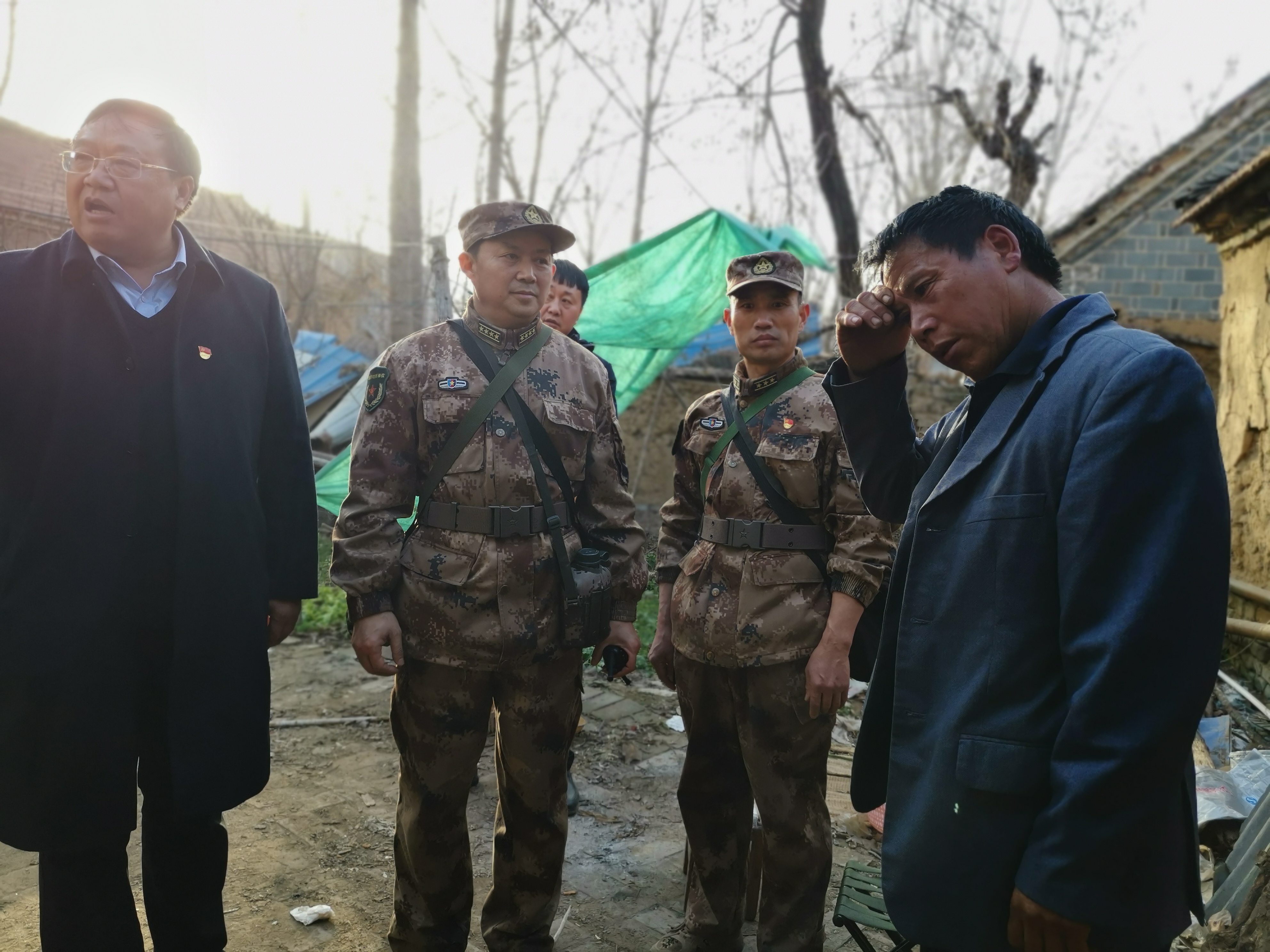 周口軍分區(qū)還將政治工作貫穿于野營(yíng)拉練全過(guò)程,當(dāng)行至周口港區(qū)苑寨行政村時(shí),薛振喜、周口軍分區(qū)政治工作處主任李揚(yáng)以及川匯區(qū)人武部部長(zhǎng)陳繼芳、政委高新傳等來(lái)到貧困戶苑立中家中慰問(wèn),為他們送去米面糧油等慰問(wèn)品??粗?jiǎn)陋的房屋,得知苑立中獨(dú)自一個(gè)人拉扯3個(gè)孩子的艱辛生活后,薛振喜囑咐當(dāng)?shù)卣臀溲b部門要想辦法幫扶這戶貧困家庭。 苑立中激動(dòng)地流下眼淚,握著薛振喜的手連聲感謝。