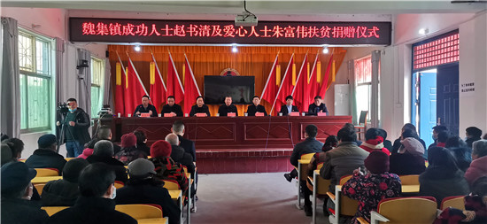 1月29日,天氣乍暖還寒,魏集鎮(zhèn)政府人頭攢動(dòng),喜氣洋洋,一片熱鬧的景象。內(nèi)蒙古希拉穆仁旅游置業(yè)開發(fā)有限公司董事長、內(nèi)蒙古楊子照明鋼桿制造有限責(zé)任公司董事長、內(nèi)蒙古周口商會(huì)會(huì)長趙書清和愛心人士朱富偉一行,帶著整整兩卡車米、面、油共計(jì)八萬元生活物資,回到家鄉(xiāng)魏集鎮(zhèn)開展扶貧濟(jì)困活動(dòng),在嚴(yán)寒的冬日給魏集鎮(zhèn)困難群眾帶來了溫暖和祝福??h政協(xié)主席孫培忠,縣委常委、宣傳部長李本磊出席活動(dòng)。魏集鎮(zhèn)黨委書記衛(wèi)春忙,鎮(zhèn)長劉艷光參加活動(dòng)。