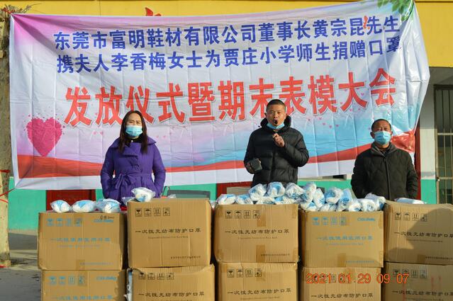 廣東省東莞市富明鞋材有限公司董事長(zhǎng)黃宗昆先生及夫人李香梅女士原籍太康縣馬頭鎮(zhèn)薛廟村,他們得知寒假將至,正值師生、家長(zhǎng)返鄉(xiāng)團(tuán)聚、走親訪友高峰時(shí)節(jié),當(dāng)前疫情防控面臨境外疫情持續(xù)爆發(fā)流行、國(guó)內(nèi)散發(fā)病例頻發(fā)的新情況、新挑戰(zhàn)。為了確保賈莊小學(xué)300多名師生生命安全和身心健康,以及他們近期疫情防控對(duì)口罩的需求,進(jìn)一步增強(qiáng)師生的防控意識(shí),夫妻二人決定為該校捐贈(zèng)3萬(wàn)只一次性醫(yī)用口罩,以實(shí)際行動(dòng)助力該校疫情防控工作。