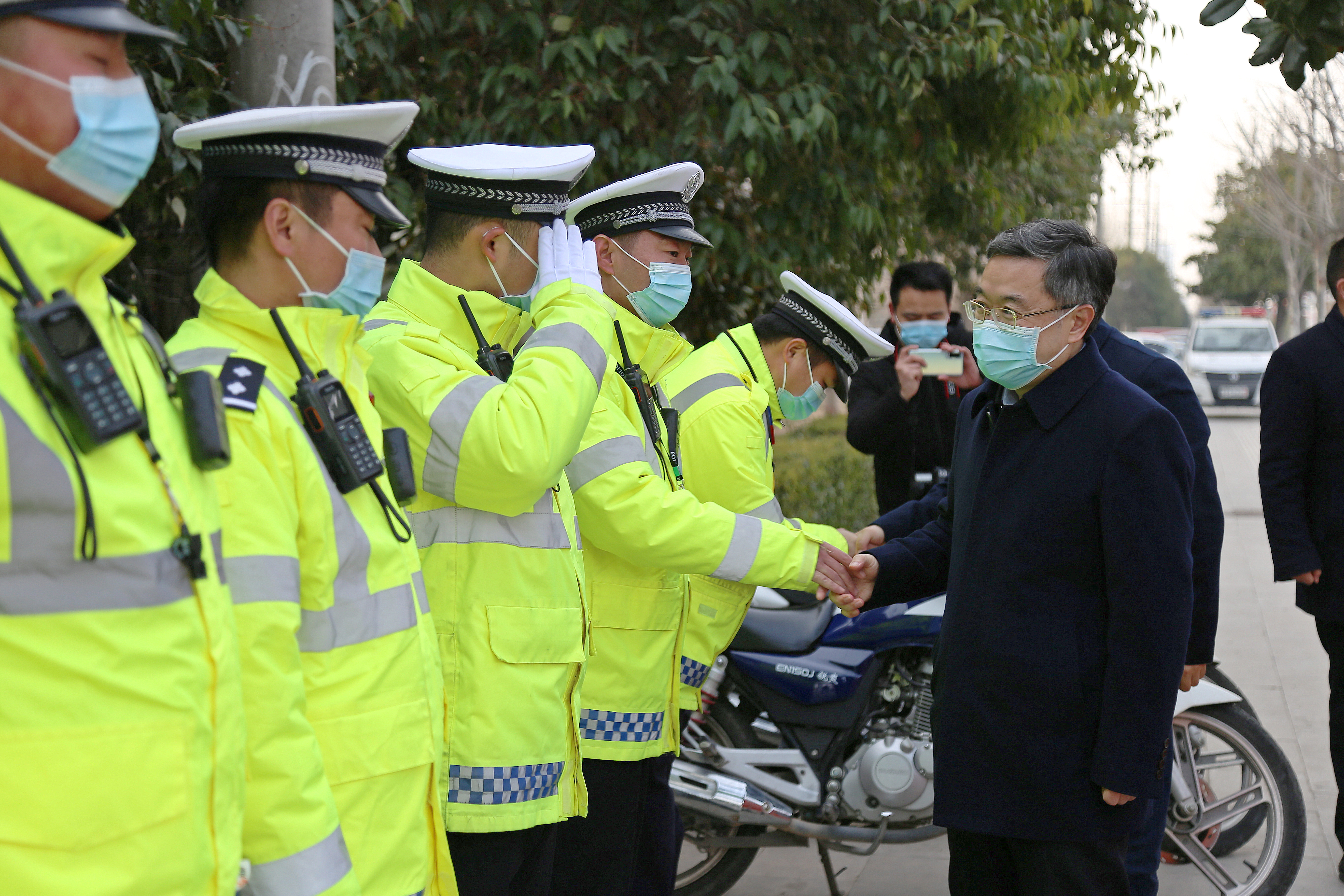 在縣交警大隊(duì)城區(qū)新區(qū)中隊(duì)五岔路口執(zhí)勤點(diǎn),皇甫立新、劉國慶同正在執(zhí)勤的交通民警一一握手,并代表縣四個(gè)班子向交警大隊(duì)全體民警、協(xié)警一年來付出的努力和辛苦表示感謝和問候,囑咐他們要注意安全,保重身體。在詳細(xì)聽取春節(jié)期間治堵保暢工作情況匯報(bào)后,皇甫立新對交警大隊(duì)全體民警和輔警在春節(jié)期間舍小家為大家,始終堅(jiān)守崗位保暢通的工作態(tài)度,以及無私奉獻(xiàn)、任勞任怨的工作作風(fēng)給予高度評價(jià)。并希望大家在春節(jié)期間,繼續(xù)發(fā)揚(yáng)吃苦耐勞的精神,科學(xué)做好道路安全保障工作,克服車多人多等困難,確保春節(jié)期間全縣道路交通安全暢通,讓全縣人民愉快度過一個(gè)平安、祥和的春節(jié)。同時(shí)要求縣交警大隊(duì)要進(jìn)一步做好執(zhí)勤民警后勤保障及防寒保暖工作,加強(qiáng)人員輪換上崗,切實(shí)保障公安交警切身利益,解決他們的后顧之憂。
