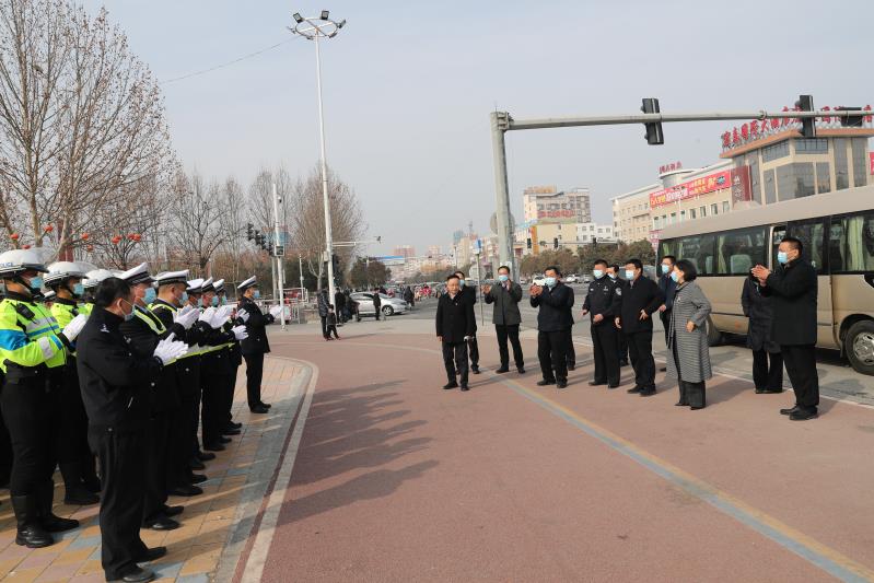 在縣人民廣場,最后王國璽、李錫勇一行看望慰問了正在執(zhí)勤的交警,與他們親切交談,對大家一年來作出的努力和貢獻表示感謝。勉勵廣大干警發(fā)揚甘于奉獻、勇于擔(dān)當(dāng)?shù)木?,維護好全縣社會大局穩(wěn)定,確保全縣人民度過一個歡樂祥和的節(jié)日。
