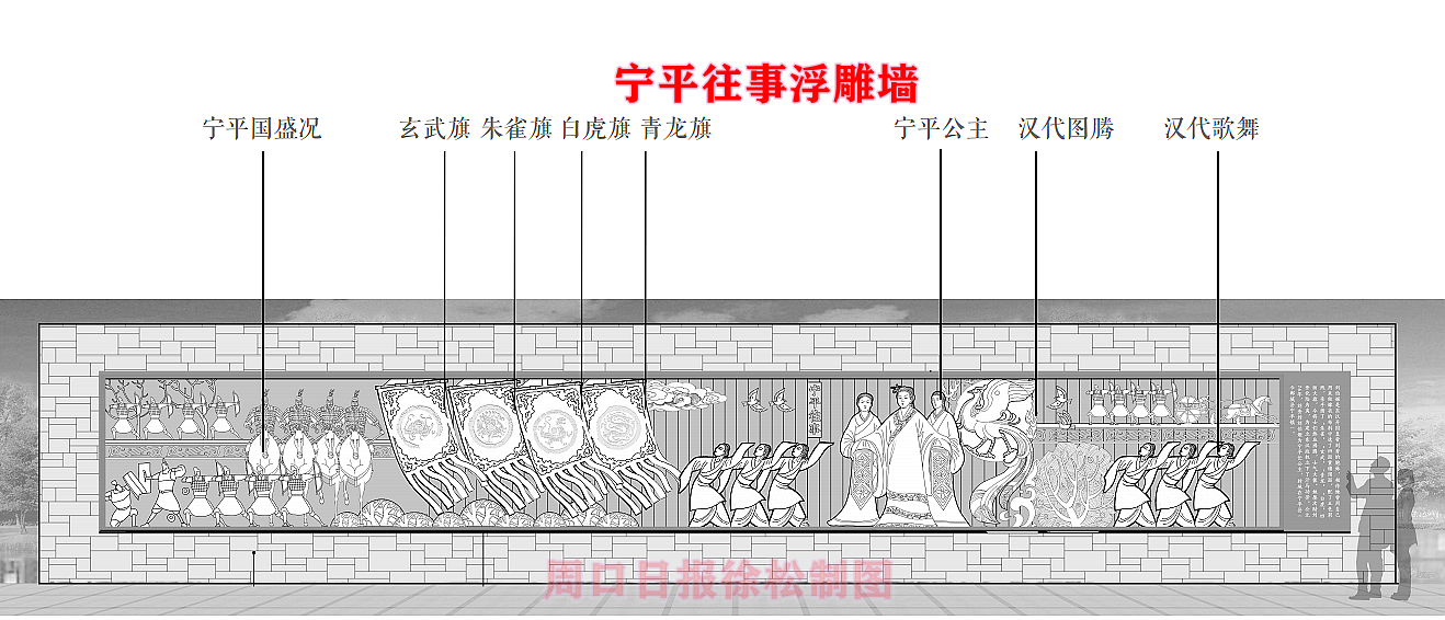在縣委、縣政府綜合大樓東側(cè)的核心形象段,配合鄲城行政中心打造莊嚴、大氣氛圍的同時,對鄲城歷史文化進行了集中展示,包括鄲城的歷史沿革,鄲城的發(fā)展理念,歷史故事等。其中調(diào)水渠西側(cè)以現(xiàn)有人民廣場對應(yīng)的綠地為基礎(chǔ),設(shè)置了較多的歷史文化節(jié)點。如調(diào)水渠新華路橋頭北側(cè)的廉政文化廣場,講述了漢朝名臣汲黯的故事。汲黯為人耿直,直諫廷諍,親政愛民,敢于承擔責任,漢武帝劉徹稱其為“社稷之臣”。汲黯廉政廣場建設(shè)在此處更有著深遠的意義,它一方面提醒老百姓要了解歷史、敬畏先賢,同時也激勵著鄲城縣的各級黨員干部要在習近平新時代中國特色社會主義思想引領(lǐng)下,“不忘初心、牢記使命、廉潔奉公、一心為民”。