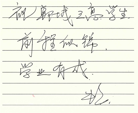 朱婷雖然很少回家,但是一直關(guān)注老家鄲城的發(fā)展變化,特別關(guān)注鄲城的教育發(fā)展,當(dāng)她得知鄲城三高率先提煉出“孝、勤、韌、忠、濟(jì)”為核心的朱婷精神,并把這種精神作為鄲城三高學(xué)子的精神引領(lǐng)時(shí)非常感動(dòng),為鄲城三高始終堅(jiān)持立德樹(shù)人的教育理念而高興,為鄲城三高學(xué)子的拼搏進(jìn)取精神而欣慰,為鄲城三高辦學(xué)成果而點(diǎn)贊,并欣然寫下:“ 祝鄲城三高越來(lái)越好,圓農(nóng)家子弟大學(xué)夢(mèng);祝鄲城三高學(xué)生前程似錦,學(xué)業(yè)有成?!?/p>