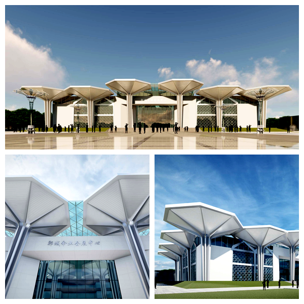 其中,傘業(yè)產(chǎn)業(yè)園電子商務服務中心項目由中國一冶承建,會展中心的設(shè)計概念以“傘啟鄲興”為主題,基于對本土特色文化的深入解讀、同時結(jié)合“傘”的具體特征,提煉傘蓋、傘骨、傘柄的特殊形象為基本元素。建筑主立面以八個巨大傘形構(gòu)架依次展開,巨型的尺度、新穎的造型有極強的昭示性,裝飾幕墻八邊形的單元分割也隱喻了傘蓋的造型,創(chuàng)新的視覺形象為傘業(yè)產(chǎn)業(yè)園增加了新的注解。會展中心整體的建筑風格充分展示了鄲城傘業(yè)產(chǎn)業(yè)園的核心價值,形成獨具特色的地標形象。