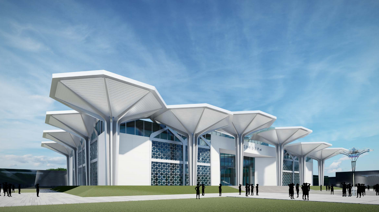 鄲城縣傘業(yè)產(chǎn)業(yè)園電子商務服務中心項目是鄲城縣傘業(yè)全產(chǎn)業(yè)鏈展銷的窗口項目、展示項目。會展中心的設計概念以“傘啟鄲興”為主題,基于對本土特色文化的深入解讀、同時結合“傘”的具體特征,提煉傘蓋、傘骨、傘柄的特殊形象為基本元素。建筑主立面以八個巨大傘形構架依次展開,巨型的尺度、新穎的造型有極強的昭示性,裝飾幕墻八邊形的單元分割也隱喻了傘蓋的造型,創(chuàng)新的視覺形象為傘業(yè)產(chǎn)業(yè)園增加了新的注解。會展中心整體的建筑風格充分展示了鄲城傘業(yè)產(chǎn)業(yè)園的核心價值,形成獨具特色的地標形象。
