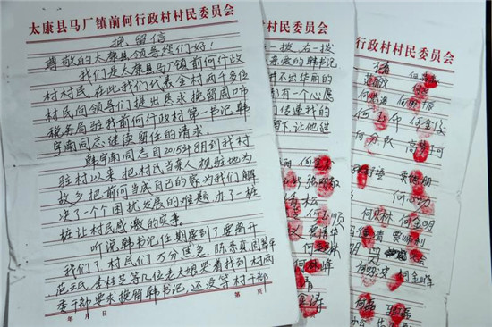 2018年,組織上考慮到韓宇南已經(jīng)在第一書記的崗位上工作了3年多,決定換他回原單位工作。前何村的群眾聽到這個消息后,多次前往馬廠鎮(zhèn)政府請愿,要求留下韓宇南繼續(xù)擔(dān)任前河村支部書記,何心功等99位村民還向國家稅務(wù)總局周口市稅務(wù)局、太康縣委縣政府寫了一封“挽留信”,并按下了99個鮮紅的手印。