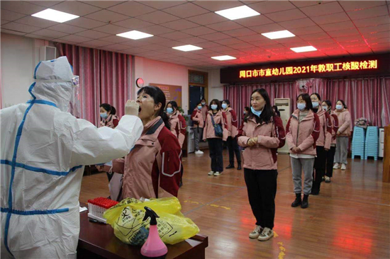 為保證市直幼兒園順利開學(xué),按照市教體局統(tǒng)一安排部署,近日,周口市婦女兒童醫(yī)院核酸檢測組對市直幼兒園全體教職工百余人順利進(jìn)行了新冠肺炎核酸檢測,檢測結(jié)果在校老師全部健康,無異常。圖為市直幼兒園教職工在進(jìn)行新冠肺炎核酸檢測。