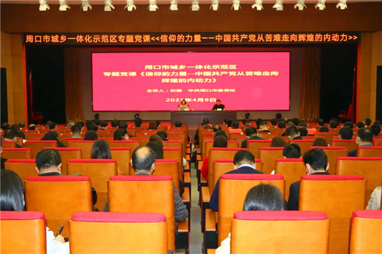 為貫徹落實習近平總書記黨史學習教育動員大會重要講話精神,全面推進全區(qū)黨史學習教育工作,4月9日上午,周口市城鄉(xiāng)一體化示范區(qū)組織專題黨課學習,邀請中共周口市委黨校黨史黨建教研室主任,副教授紀穎講授《信仰的力量——中國共產(chǎn)黨從苦難走向輝煌的內(nèi)動力》專題黨課,示范區(qū)副處級以上干部、區(qū)直全體黨員干部、鄉(xiāng)、辦、站、所負責人、全體村(社區(qū))支部書記參加會議。