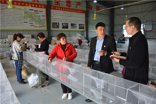 4月11日,商水縣平店鄉(xiāng)大朱莊村扶貧車間里留守女工正在編織漁網(wǎng)。該縣各級紀檢部門切實加強對扶貧資金資產(chǎn)的監(jiān)督管理,確保了扶貧項目產(chǎn)業(yè)正常運行,有效促進了廣大留守婦女家門口就業(yè)增收。圖為縣鄉(xiāng)紀委干部在扶貧車間調(diào)查了解資產(chǎn)管理群眾收益工人收入等情況。