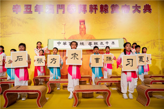 在儀程“高唱頌歌”環(huán)節(jié),30名澳門小學(xué)生身穿漢服,邊唱《黃帝頌》邊在小書桌上書寫毛筆字。隨后,孩子們舉起書寫的姓氏,后排兩名身穿漢服的老師打開“中華百家姓”卷軸,引來參加拜祖活動(dòng)的來賓陣陣掌聲。今年拜祖活動(dòng)現(xiàn)場(chǎng)組織了一個(gè)百人的漢服方陣,順應(yīng)流行的“國(guó)潮風(fēng)”,成為拜祖活動(dòng)的又一個(gè)亮點(diǎn)。