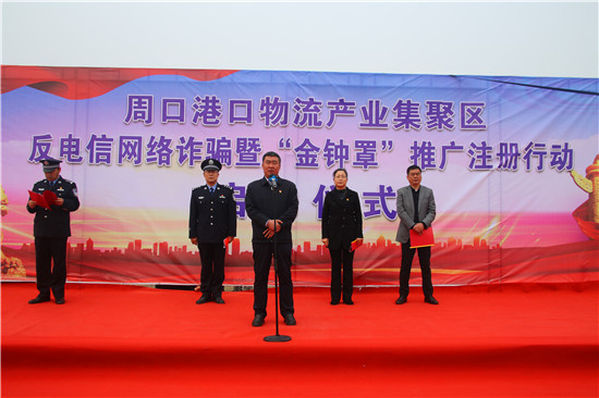 為打擊治理電信網絡詐騙犯罪,降低詐騙案件發(fā)生率,4月13日,周口港區(qū)舉辦反電信網絡詐騙宣傳暨“金鐘罩”推廣注冊行動啟動儀式,宣傳反電詐知識,推廣公安部門推出的反詐騙系統(tǒng)平臺“金鐘罩”。港區(qū)黨委書記孫鵬到場宣布行動正式啟動,港區(qū)黨委委員、紀委書記李素芹,公安分局局長康群泉在儀式上講話。