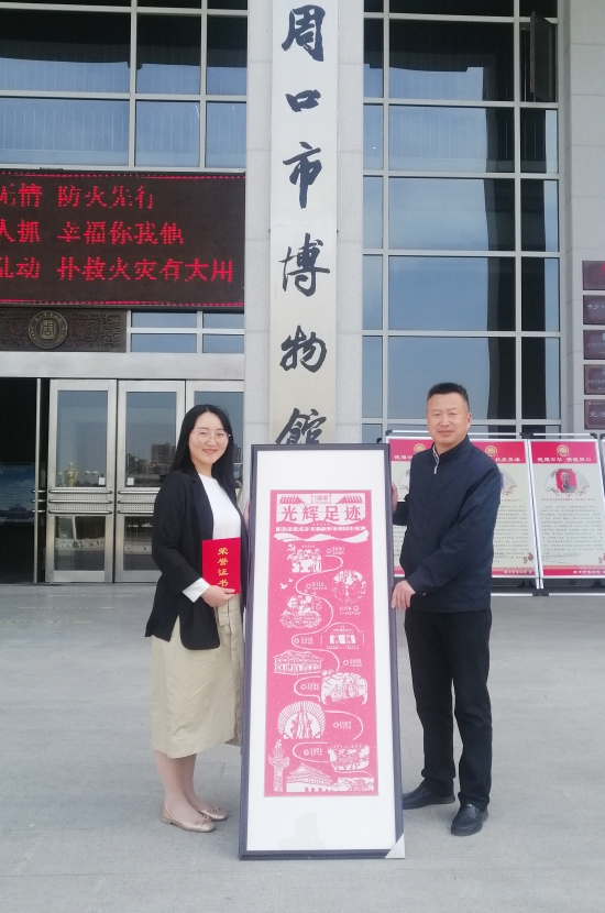 4月28日,河南科技職業(yè)大學(xué)老師范文華來到周口市博物館,將自己的剪紙作品“光輝足跡”捐贈給周口市博物館,在建黨100周年之際,表達(dá)一位教育工作者的殷殷之情。周口市博物館館長周建山向其頒發(fā)榮譽(yù)證書。