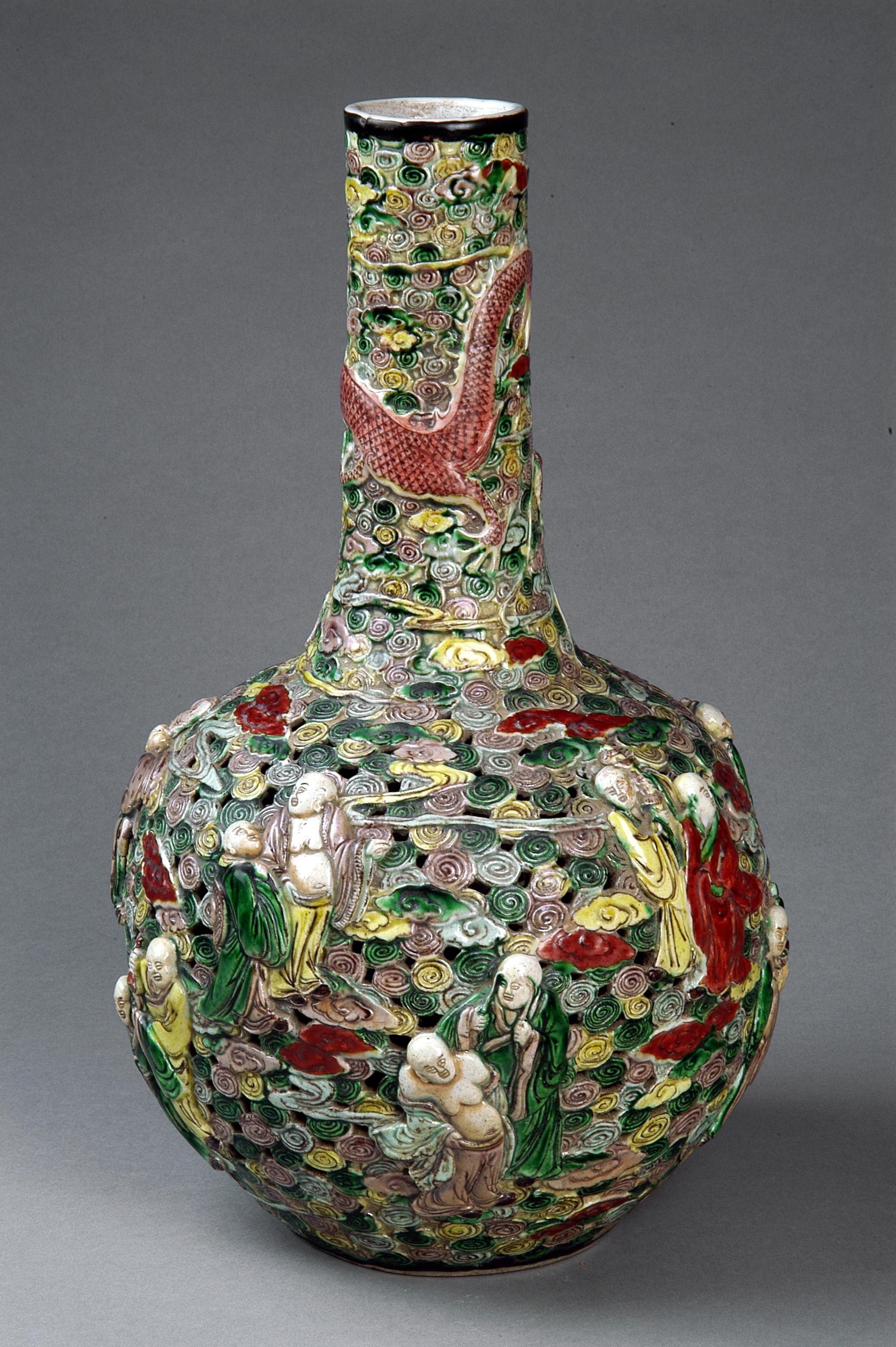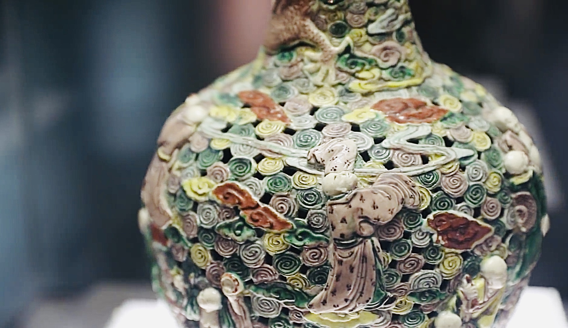 我是五彩透雕十八羅漢云龍瓶,又名古瓷流韻天球瓶。靜謐的空間里,我站在周口市博物館的玻璃展柜里,瞅瞅四周的兄弟姐妹,我偷偷笑了。雖沒(méi)有長(zhǎng)睫毛和雙眼皮,但我可是個(gè)十足的“混血兒”。技藝精湛、圖案華貴、色彩艷麗,我的稀有性和珍貴性常常讓來(lái)訪(fǎng)者驚嘆不已。和青花瓷相比,我更加瑰麗多彩,人稱(chēng)文物界的“米蘭·可兒”。