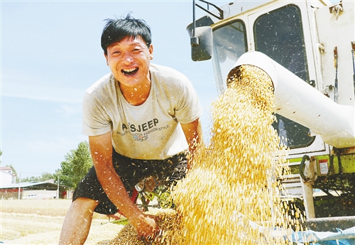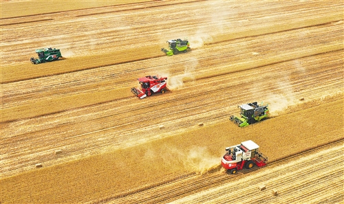 開封市尉氏縣邢莊鄉(xiāng)府李莊村,農(nóng)機(jī)服務(wù)隊(duì)幫助村民收獲小麥。 李新義攝(中經(jīng)視覺)