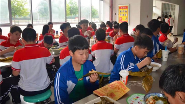 6月14日,端午節(jié),鄲城縣第二實(shí)驗(yàn)中學(xué)朱玉良、李繼元等校領(lǐng)導(dǎo)在餐廳和學(xué)生一起集體過(guò)端午。