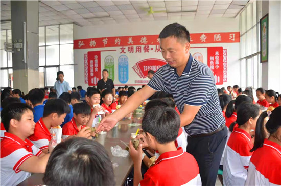 朱玉良、李繼元等詢問后勤處粽子準備的充足不充足,并走到學(xué)生中去,把散發(fā)著芳香的粽子送到大家手中,一邊叮嚀著說,不夠吃再拿,不過不要浪費。懂禮貌的孩子們雙手從校長手中接過熱乎乎的粽子,連聲說謝謝。