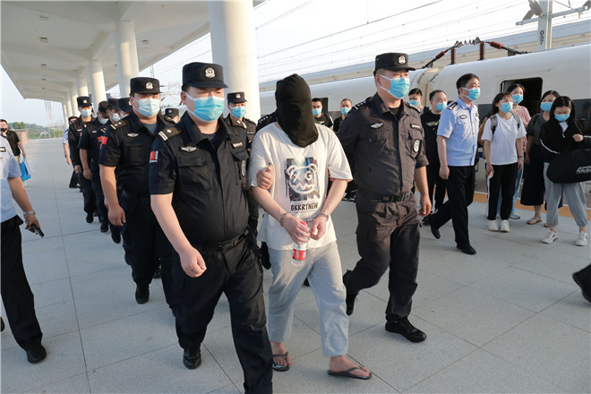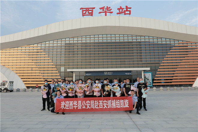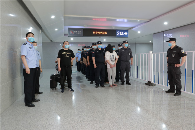 當(dāng)天,西華縣公安局在鄭阜高鐵西華站舉行歡迎儀式,迎接赴西安抓捕組凱旋歸來。特警在站臺上排列整齊、嚴(yán)陣以待,列車準(zhǔn)時(shí)停靠到站,7名犯罪嫌疑人隨即被押解下車,全副武裝的特警立即上前進(jìn)行押解交接,押往在高鐵出站口等候的裝甲車上。至此,歷經(jīng)三天三夜,一起電信網(wǎng)絡(luò)詐騙團(tuán)伙案成功告破。