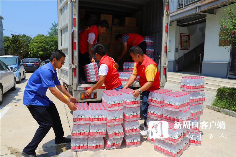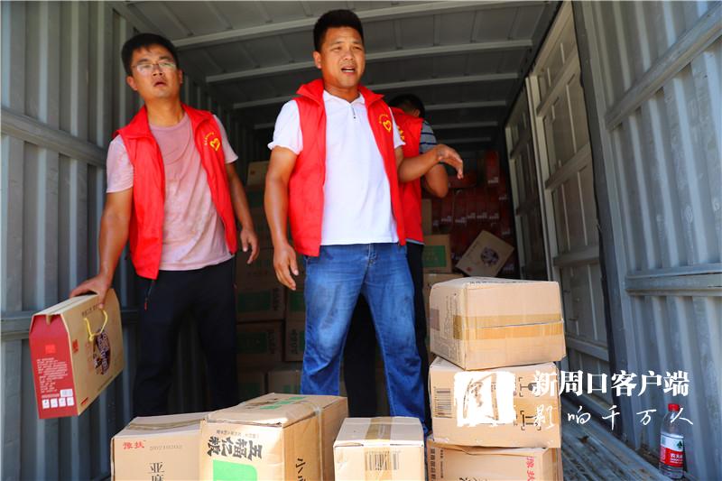 當(dāng)天中午,掛著印有“昨天大家助我脫貧,今天我為救災(zāi)出力!”條幅的防汛救災(zāi)物資運輸車抵達(dá)周口港區(qū)?!耙皇乔皟商旆烙_風(fēng)‘煙花’,我們早就來了。”隆古村黨支部書記段長春一下車就連忙慰問眾人。一同前往的還有6位年輕力壯的志愿者,他們不辭勞苦,和港區(qū)消防、城管人員一起頂著烈日,用了半個多小時將滿車物資搬運到位。