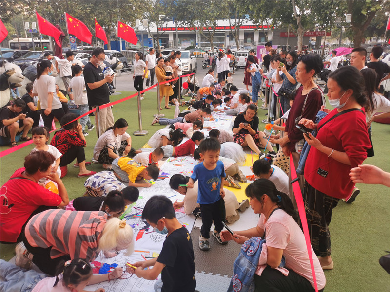 10月1日下午,在位于周口市中心城區(qū)七一路與中州大道交叉口的萬果園家庭茂商超前,近百名小朋友聚集在一起用手中的畫筆表達對祖國母親的祝福。