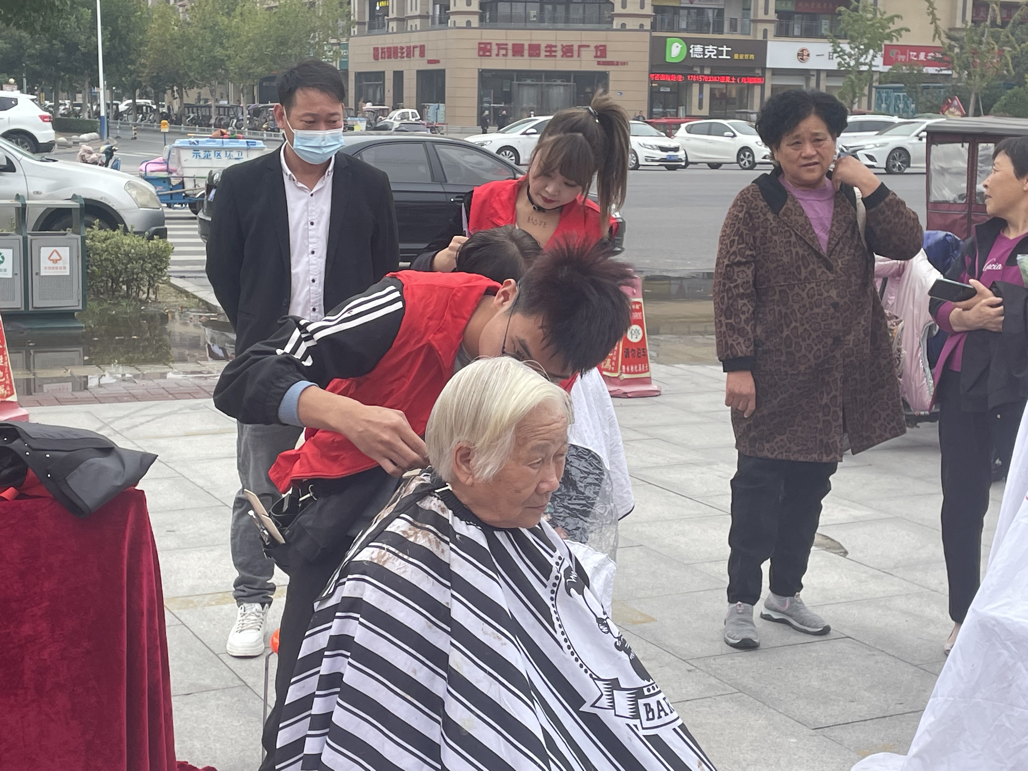 10月14日,在川匯區(qū)文昌大道的中原社區(qū)A區(qū)大門(mén)口,數(shù)十名身穿紅馬甲的志愿者在忙著幫社區(qū)老年人截褲腳、剪頭發(fā)、補(bǔ)鞋子。志愿者們深入社區(qū),為老年人服務(wù)。此外,他們還在蓮花路、太昊路、文明路、交通路街頭值勤,助力文明周口建設(shè)。①5