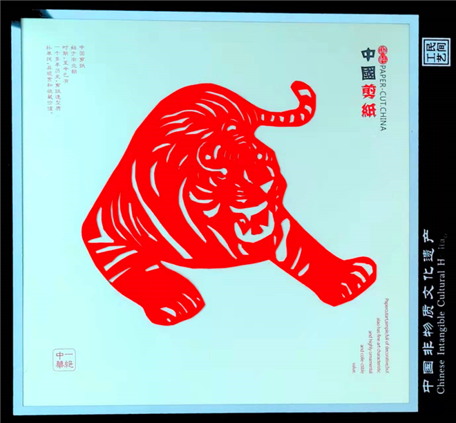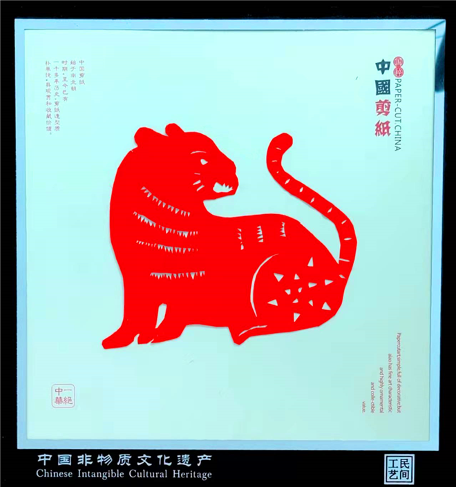 為了慶?;⒛?,王春梅創(chuàng)作的秸稈畫主要有《威震九霄》《虎之王者》《飛天神虎》等,此外,她還創(chuàng)作了兩幅剪紙作品,分別是《虎年組圖》和《虎之2022》。和剪紙作品相比,秸稈畫制作工序更加復(fù)雜,全憑手工完成,充分利用秸稈本身的紋理和質(zhì)地,結(jié)合顏色、溫度的變化,將畫面立體的呈現(xiàn)出來。其中,她創(chuàng)作的部分作品結(jié)合了唐卡的相關(guān)風(fēng)格和顏色配比,比如《威震九霄》中虎的形象所表現(xiàn)出來的力量感借鑒了唐卡中護(hù)法的力量感;《虎之王者》和《虎之2022》中對于藍(lán)色的運(yùn)用結(jié)合了唐卡中的藍(lán)色,代表了永恒不變,如同穹蒼攬護(hù)萬物之意。
