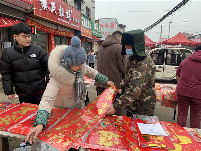 春節(jié)將至,不斷映入眼簾的喜慶“福”字映襯著摩肩接踵的人群。趕集時,家家都要買幾張年畫、幾副春聯(lián),今年,以“虎”為主題的年畫春聯(lián)自然成了主角?!斑@個虎頭年畫今天已經(jīng)脫銷了,這個‘年年有余’的也喜慶?!睌傊魍醮蠼阋贿厧皖櫩吞裟戤嬕贿呅χf。年前,她早早囤好了近百種樣式的老虎年畫,現(xiàn)在看來還是不夠賣。除了過年必備的年畫春聯(lián),她還準(zhǔn)備了紅燈籠、紅燭等,也十分暢銷。