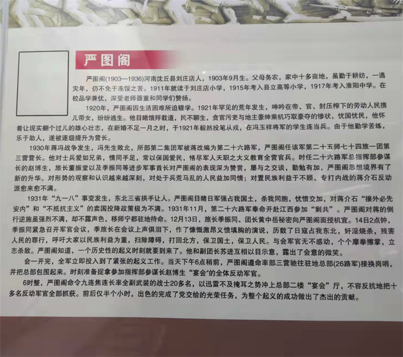 嚴圖閣出生于1903年,河南省沈丘縣人。1911年,嚴圖閣被父親送進劉莊店小學讀書,1915年考入縣立高等小學,1917年投考淮陽中學被錄取。他刻苦讀書,成績優(yōu)異,深得老師和同學們的贊揚。1921年,他毅然背井離鄉(xiāng),外出從軍。1930年,嚴圖閣任國民革命軍第二十六路軍一團三營營長。1931年12月,參加著名的寧都起義,成為中國共產黨領導的革命隊伍中的一員。寧都起義后,嚴圖閣所在部隊改編為紅軍第五軍團,由于其驍勇善戰(zhàn),累積戰(zhàn)功,被任命為第十六師參謀長。1932年,嚴圖閣正式加入中國共產黨。1935年在湖北一場戰(zhàn)斗中身負重傷,后轉移至湖南省平江縣治療。1936年3月,嚴圖閣奉命擔任湘鄂贛省軍區(qū)司令員職務,進行游擊戰(zhàn)爭,為保衛(wèi)湘鄂贛革命根據(jù)地作出了貢獻。1936年11月,嚴圖閣因病不幸去世。