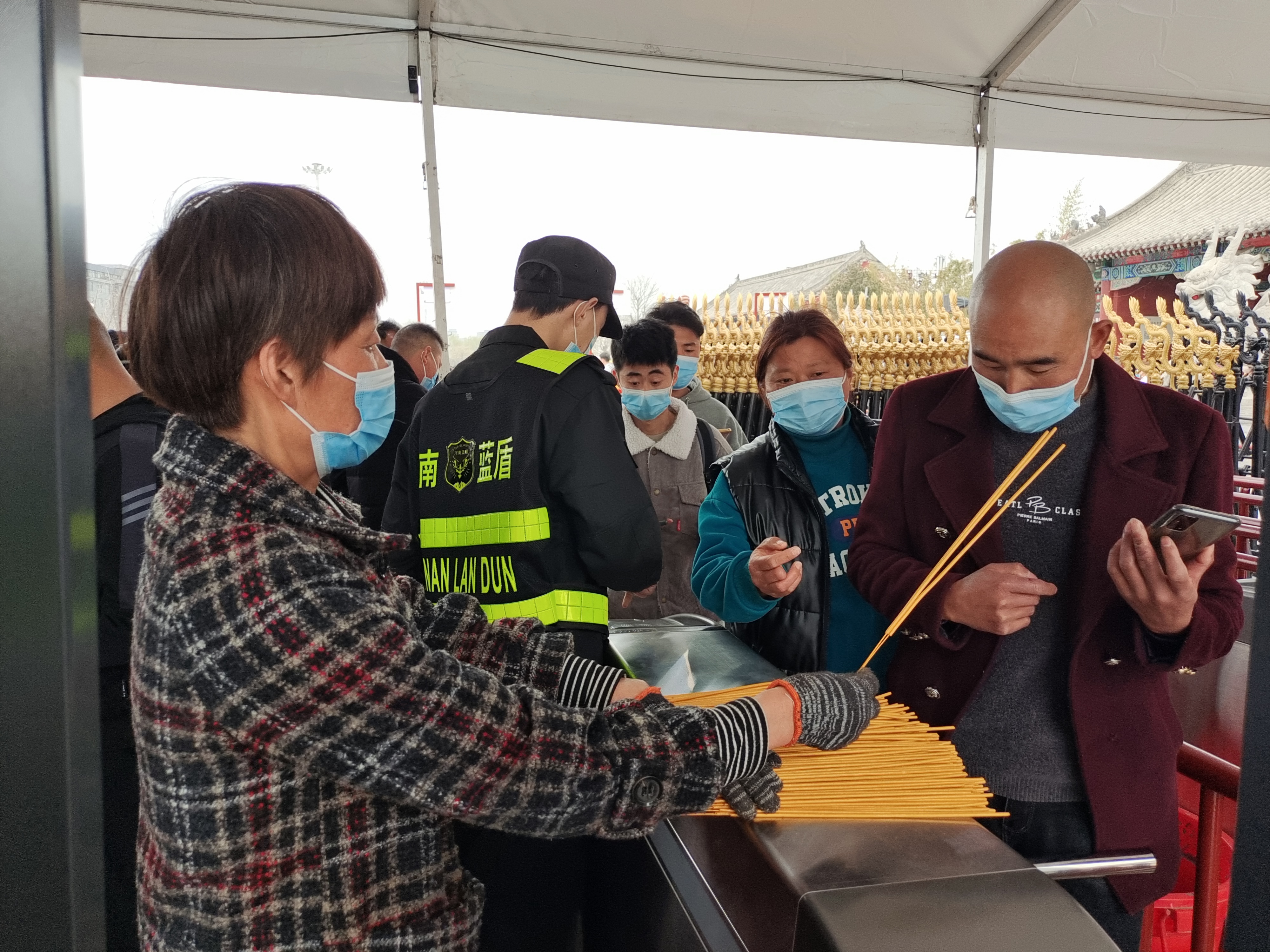 “這是您的祈福香,請(qǐng)拿好?!碧涣甑拿總€(gè)入口,既有專人檢查私自帶香行為,也有工作人員為游客免費(fèi)發(fā)放線香。家住淮陽(yáng)區(qū)的李姐是其中一員,她早上5時(shí)30分就到達(dá)景區(qū),領(lǐng)取線香并整理,方便為游客發(fā)放?!爸灰€有游客來(lái),我們就不休息,要把祈福的心愿送到他們手中,并引導(dǎo)他們文明燒香、文明祭祀?!崩罱阏f(shuō)。