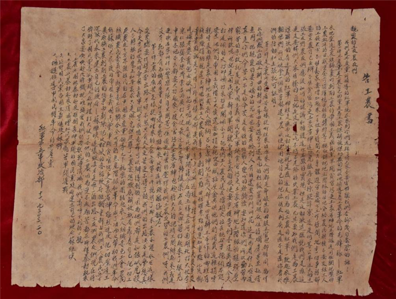 1928年7月22日,彭德懷領(lǐng)導湘軍獨立第五師第一團等部于湖南省平江城起義。不久,部隊即奉命改編為中國工農(nóng)紅軍第五軍第十三師。1930年6月,紅五軍在湖北省大冶縣編入紅三軍團。根據(jù)《紅軍第五軍政治部告工農(nóng)書》的落款時間及內(nèi)容可以看出,此布告落款時間為1930年3月20日,它是研究紅五軍開展農(nóng)民工作、宣傳工作和紅五軍光輝歷史的重要史料佐證。