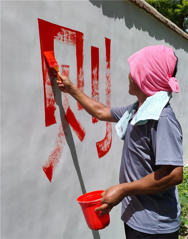 當(dāng)天早晨6時(shí),鹿邑縣書(shū)畫(huà)名師工作室負(fù)責(zé)人譚偉帶領(lǐng)孟凡奎、朱暢然、安磊、張存占等書(shū)法名師,驅(qū)車(chē)10多公里,趕到鄭家集鄉(xiāng)中心小學(xué)。老師們站在毫無(wú)遮蔽的炎炎烈日下,有的手拿尺子和粉筆起稿,有的手拿刷子和顏料涂色,有的手提水桶調(diào)制顏料,他們從操場(chǎng)的一端慢慢移動(dòng)到另一端。臨近中午,氣溫越來(lái)越高,雖然他們汗流浹背,曬得滿(mǎn)臉通紅,但他們還是堅(jiān)持到最后一刻。歷經(jīng)6個(gè)多小時(shí)后,他們終于將一個(gè)個(gè)方正大氣的黑體字、一個(gè)個(gè)簡(jiǎn)約生動(dòng)的運(yùn)動(dòng)圖標(biāo)呈現(xiàn)在大家眼前。