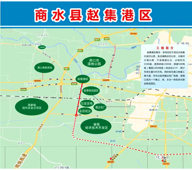 2017年,商水縣政府按照前瞻30年、謀劃15年、做實近5年工作要求,開始規(guī)劃修建位于湯莊鄉(xiāng)趙集行政村以西,張莊鎮(zhèn)韓莊村以東,沙潁河大堤以南,寧洛高速以北的趙集作業(yè)區(qū)。規(guī)劃建設(shè)占地約720畝、總投資6.37億元的趙集港項目,同時修建12個1000噸級泊位,其中散貨泊位8個,通用泊位2個,多用途泊位2個,占用岸線1250米,預計年吞吐量達475萬噸。碼頭采用順岸式布置,結(jié)構(gòu)采用重力式扶壁結(jié)構(gòu),前沿配置30噸門座式固定吊裝卸作業(yè)。港口涵蓋貨物拆解區(qū)、散件堆放區(qū)等4個功能區(qū),集裝箱露天堆場、大型貨車停車場等5個場地。圍繞趙集港,高標準規(guī)劃建設(shè)占地約6.2平方公里的多式聯(lián)運臨港經(jīng)濟園區(qū),下設(shè)金田紙業(yè)、建材倉儲兩個物流園區(qū),涵蓋建材及建材制品園區(qū)、造紙業(yè)原料及成品園區(qū)、紡織服裝原料及成品園區(qū)3個功能園區(qū)。該項目建成投入使用后,不但能加快商水縣紡織園區(qū)、循環(huán)園區(qū)、經(jīng)濟開發(fā)區(qū)、隆達電廠等企業(yè)物質(zhì)的流轉(zhuǎn),而且能使商水港成為周口沙潁河重要的鐵運、陸運、水運交通樞紐、貨物貿(mào)易和物流中轉(zhuǎn)聚集區(qū),從而進一步促進商水經(jīng)濟的健康、快速發(fā)展。