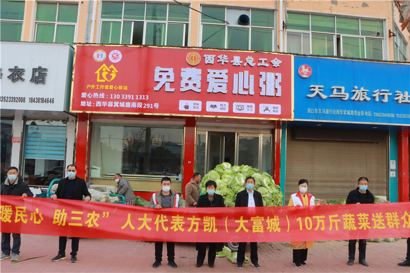 冬日暖陽(yáng),愛(ài)意融融。12月7日,河南省西華縣人民醫(yī)院、中醫(yī)院、敬老院的院子里,掌聲陣陣,笑語(yǔ)歡聲,洋溢著溫馨、祥和的氣氛?!爸袊?guó)好人”、周口市人大代表方凱幫助黃橋鄉(xiāng)菜農(nóng)解決蔬菜滯銷(xiāo)難題,并通過(guò)西華縣紅十字會(huì)向這些單位捐贈(zèng)10萬(wàn)斤蔬菜,讓滯銷(xiāo)菜變“暖心菜”。方凱的這一舉動(dòng),受到群眾的稱(chēng)贊。