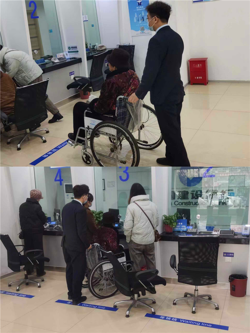 3月27日上午11點(diǎn)左右,項城蓮花大道支行大堂經(jīng)理張云磊在門口引導(dǎo)客戶時,發(fā)現(xiàn)兩位客戶扶著另一位客戶走進(jìn)網(wǎng)點(diǎn)。注意到客戶雙腿行走不便,他立即推來輪椅,把客戶扶到輪椅上。三位客戶不熟悉銀行辦業(yè)務(wù)流程,大堂經(jīng)理張云磊全程跟隨指導(dǎo)辦理業(yè)務(wù)。經(jīng)詢問,大堂經(jīng)理得知客戶前來辦理社??せ顦I(yè)務(wù),以便領(lǐng)取殘疾人補(bǔ)貼。大堂經(jīng)理立即幫他安排綠色通道,幫助家屬推輪椅到柜臺辦理,在一旁指導(dǎo)客戶填單跟簽名。