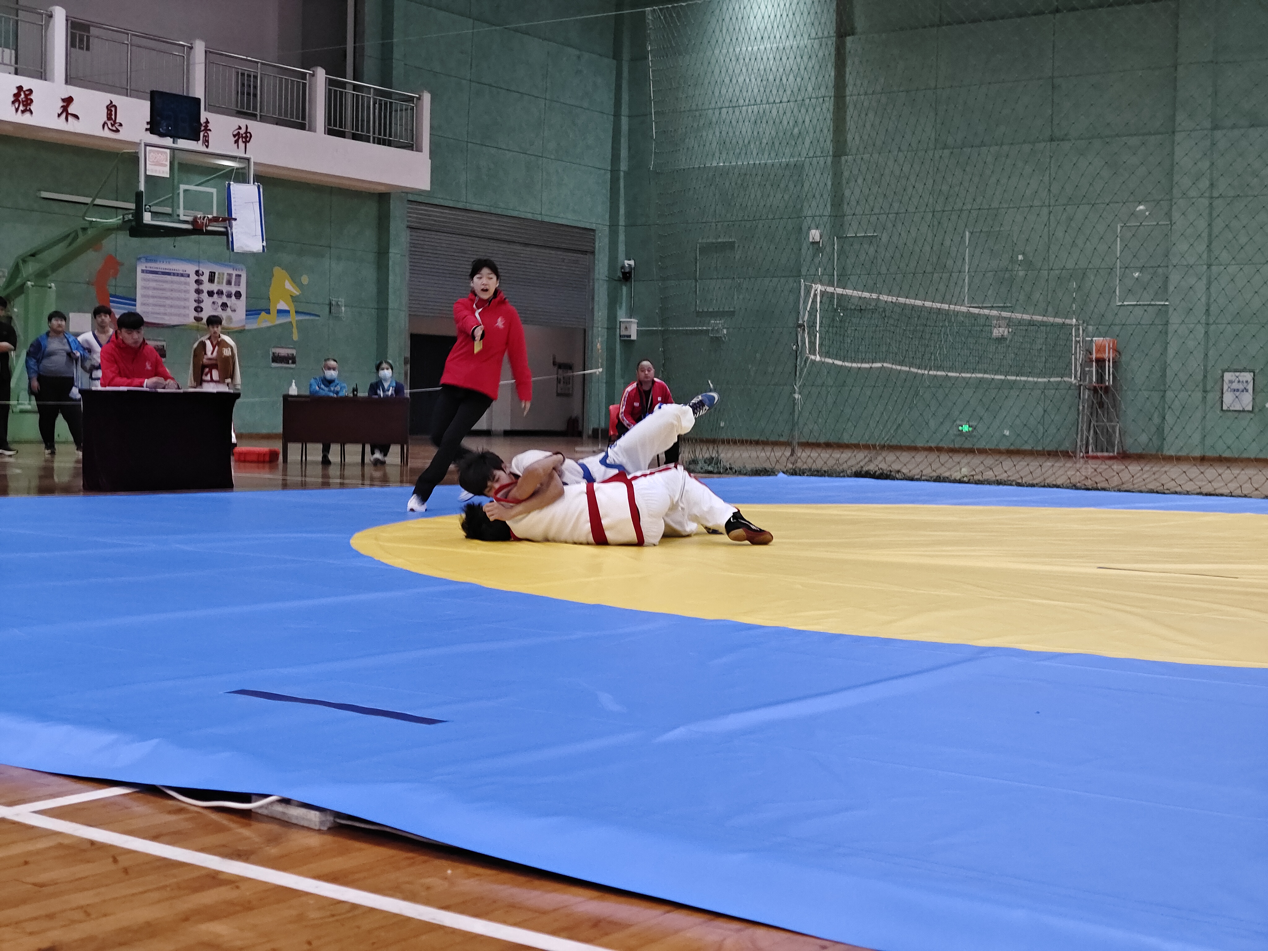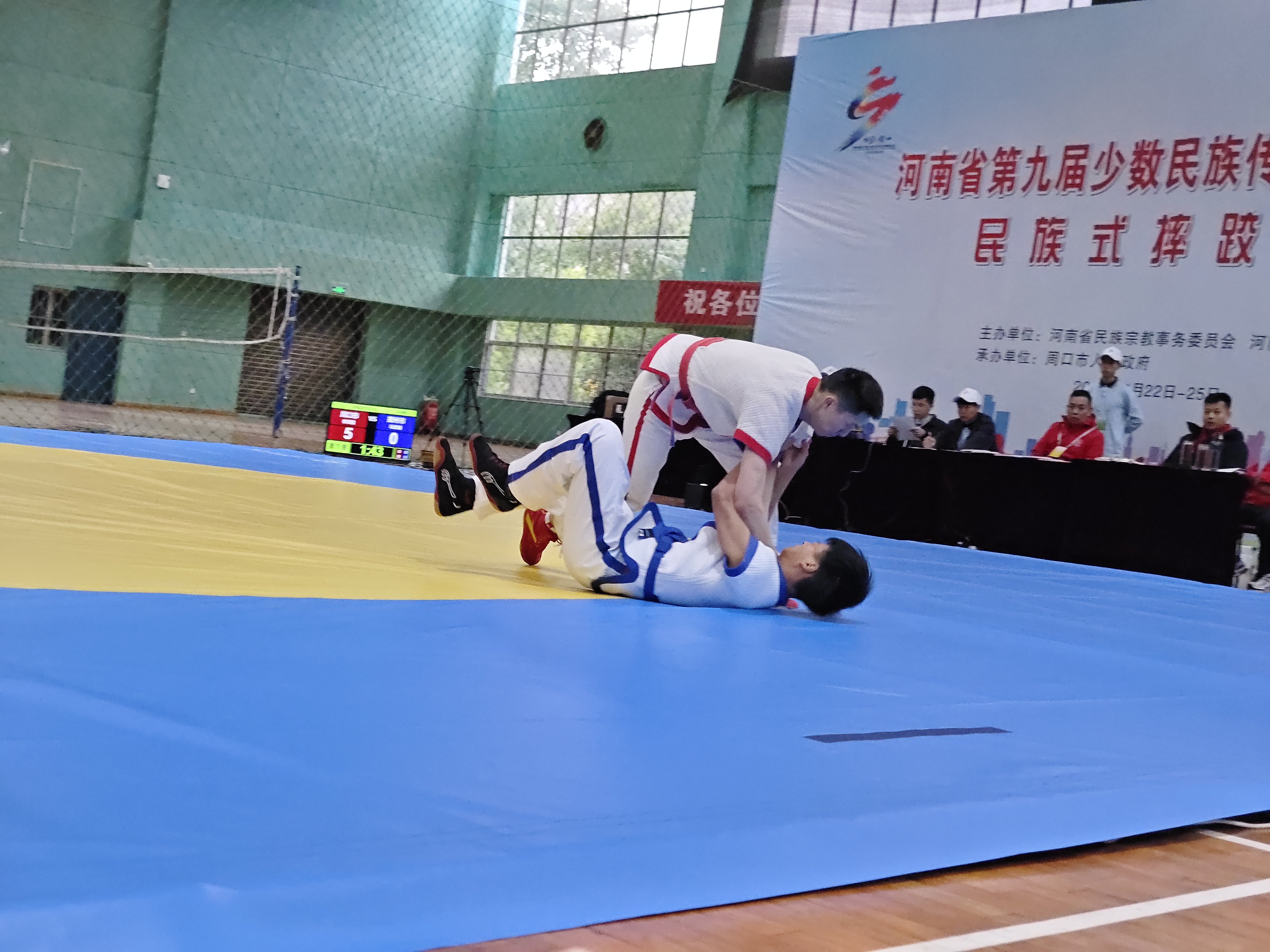 當(dāng)日,河南省第九屆少數(shù)民族傳統(tǒng)體育運(yùn)動(dòng)會(huì)民族式摔跤競(jìng)賽項(xiàng)目在周口師范學(xué)院老體育館開賽。絆跤是首個(gè)登場(chǎng)的跤種,9支代表隊(duì)參賽。該跤種以體重級(jí)別分組進(jìn)行雙敗淘汰賽,共有52kg、62kg、74kg、87kg和87kg以上等5個(gè)公斤級(jí),對(duì)應(yīng)5個(gè)一等獎(jiǎng)。經(jīng)過激烈角逐,來自漯河市、周口市和河南大學(xué)代表隊(duì)的5名選手獲得一等獎(jiǎng),我市選手李祥楷、劉小濤分別獲62kg、87kg一等獎(jiǎng)。