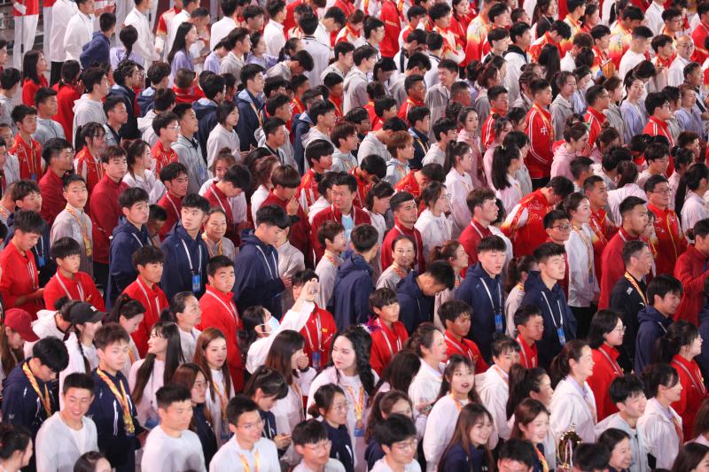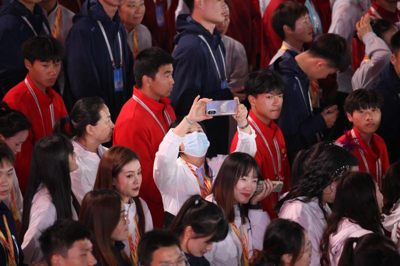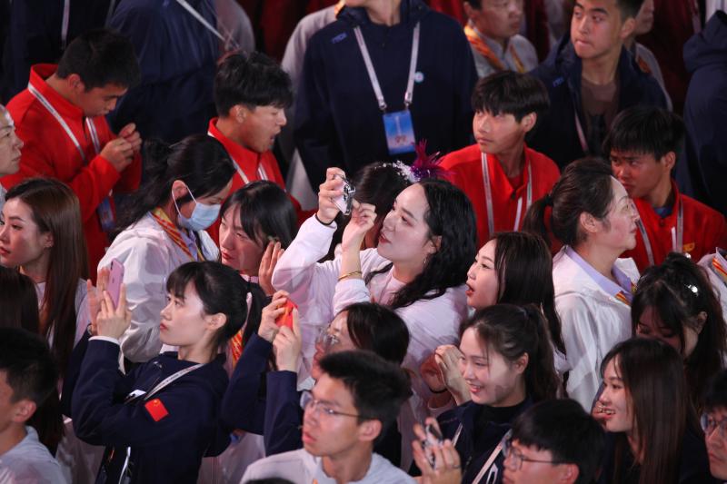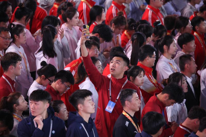 閉幕式上,來自全省各地的運動員用手機記錄下精彩瞬間。記者 劉俊濤 攝