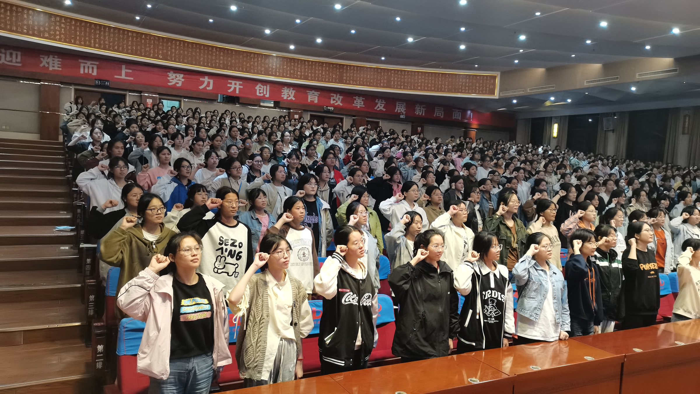 最后,在劉老師的帶領(lǐng)下全體同學(xué)舉起右拳莊嚴(yán)宣誓:做堅強(qiáng)不屈的女生,做自強(qiáng)不息的女生,做拼搏奮斗的女生......