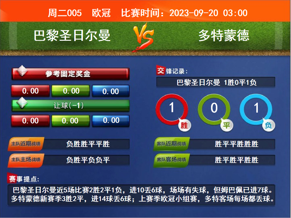 比賽時間:2023-09-20 03:00賽事提點:巴黎圣日爾曼近5場比賽2勝2平1負,進10丟6球,場場有失球,但姆巴佩已進7球。多特蒙德新賽季3勝2平,進14球丟6球;上賽季歐冠小組賽,多特客場每場都丟球。
