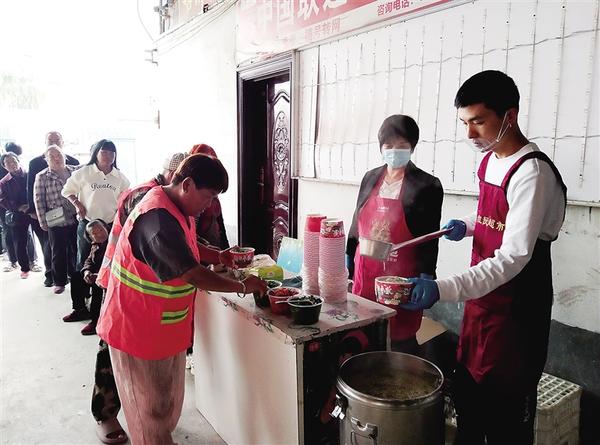 10月10日,重陽節(jié)前夕,清晨第一縷陽光灑向大地,錢廣新已經(jīng)忙碌起來,在他和廚師的精心準(zhǔn)備下,一鍋鍋熱氣騰騰、香氣四溢的綠豆面條端了出來。錢廣新一邊熱情地招呼老人排隊(duì),一邊動手盛飯,微笑掛在嘴角,快樂寫在臉上。