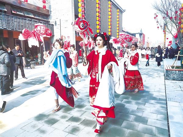 翠袖紅裙、直襟長袍……身著漢服的演員,手持魚燈,巡游關帝老街,伴隨著樂曲翩翩起舞,成為一道靚麗的風景線。