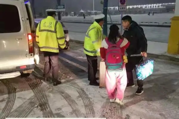 當(dāng)男子的女兒順利到達(dá)高鐵站后,交警們又將他送回原地。看到救援人員已經(jīng)到達(dá),交警們?cè)俅瓮度氲窖┮沟难策壷?。他們的熒光黃制服與白雪交相輝映,成為雪夜里最溫暖的色彩。②2