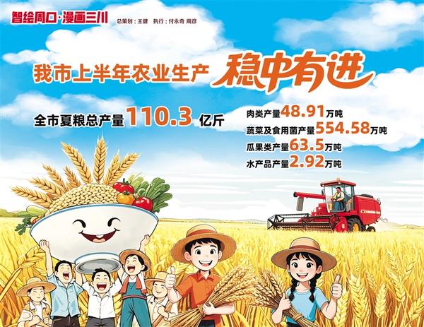2025年上半年,我市農(nóng)業(yè)生產(chǎn)穩(wěn)中有進(jìn)。全市夏糧總產(chǎn)量110.3 億斤,同比增長0.01%,980.1萬畝秋糧長勢(shì)良好,豐收豐產(chǎn)基礎(chǔ)扎實(shí);肉類產(chǎn)量48.91萬噸,同比增長3.19%;蔬菜及食用菌產(chǎn)量554.58萬噸,同比增長3.28%;瓜果類產(chǎn)量63.5萬噸,同比增長3.73%; 水產(chǎn)品產(chǎn)量2.92萬噸,同比增長4.2%。記者 付永奇 周彥 文/圖
