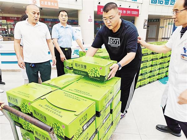 9月7日下午,來自黃泛區(qū)農(nóng)場的時先生(右二)將270箱自家農(nóng)場種植的葡萄捐贈給周口港區(qū)醫(yī)院,與醫(yī)護人員一起分享雙重喜悅:自家果園的豐收和他個人的身體康復(fù)。