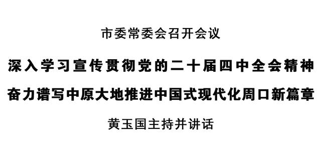 會(huì)議強(qiáng)調(diào),要把學(xué)習(xí)宣傳貫徹黨的二十屆四中全會(huì)精神,作為各級(jí)黨委(黨組)理論學(xué)習(xí)中心組集體學(xué)習(xí)的重要內(nèi)容,納入黨校(行政學(xué)院)教育培訓(xùn)的必修課程,做到黨員干部全覆蓋;各級(jí)宣傳部門要充分利用各種形式和手段,做好權(quán)威解讀和分眾化傳播,讓廣大黨員干部群眾聽得懂、記得住、落實(shí)在行動(dòng)上;要把貫徹落實(shí)全會(huì)精神與習(xí)近平總書記在河南考察時(shí)重要講話精神緊密結(jié)合起來,聚焦“兩高四著力”,錨定“1+2+4+N”目標(biāo)任務(wù)體系,落實(shí)市委“16232”總體工作思路,突出抓好重點(diǎn)項(xiàng)目建設(shè)和招商引資、農(nóng)業(yè)農(nóng)村、城市規(guī)劃建設(shè)管理、文旅發(fā)展、民生實(shí)事、社會(huì)治理等重點(diǎn)工作,全力以赴打贏“十四五”收官戰(zhàn),高質(zhì)量編制“十五五”規(guī)劃,切實(shí)把全會(huì)部署轉(zhuǎn)化為推動(dòng)現(xiàn)代化周口建設(shè)的實(shí)際行動(dòng)。