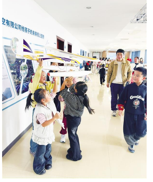 小記者近距離觀察航模。近日,周口日?qǐng)?bào)小記者部攜手周報(bào)航空俱樂部,組織70余名小記者開展了一場(chǎng)別開生面的無人機(jī)科普研學(xué)活動(dòng),小記者在沉浸式體驗(yàn)中感受到了科技的魅力。