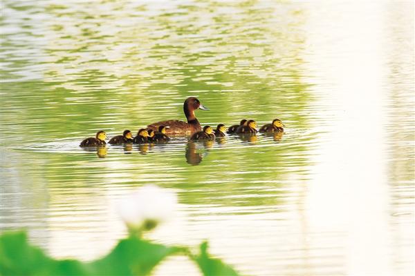 6月24日,世界極度瀕危物種、國家一級保護(hù)野生動物青頭潛鴨現(xiàn)身淮陽龍湖。當(dāng)日,一只青頭潛鴨帶著10只可愛的“鴨寶寶”在湖中緩緩游弋。有關(guān)方面人士告訴記者,種種跡象可以證明:青頭潛鴨已在淮陽龍湖國家濕地公園安家落戶、繁衍生息。