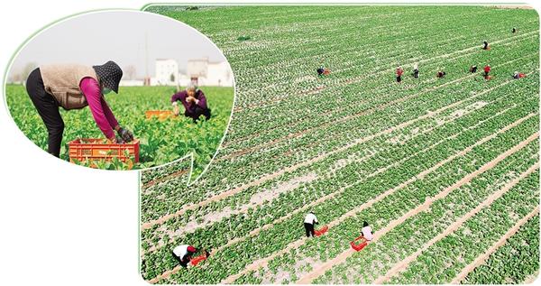 近年來,我市積極推廣“合作社+農(nóng)戶”“家庭農(nóng)場+農(nóng)戶”經(jīng)營模式,鼓勵農(nóng)民通過土地流轉(zhuǎn)將分散耕地整合起來,實現(xiàn)集中化、規(guī)模化經(jīng)營,全力提高土地利用效率,為鄉(xiāng)村振興注入強勁動力。圖為4月11日,在淮陽區(qū)王店街道范莊行政村的農(nóng)田里,村民正采收蔬菜。