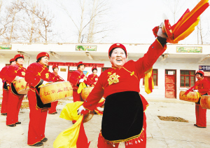 ?、芊鰷峡h江村鎮(zhèn)江南盤鼓隊正在村室緊張排演節(jié)目。春節(jié)期間,她們走上街頭,為當?shù)厝罕娝蜕衔幕蟛汀?nbsp; (記者 王 映 攝)
