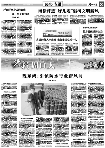 眼下,他正在做一個新型施工體系的示范、推廣工作。這個施工體系簡而言之,就是用新型的非固化膠體粘合防水材料,直接鋪在施工面上,一改過去用噴槍粘合的方式,省工省時,防水效果更佳。“這個體系做好了,將徹底改變以往的防水工藝?!蔽簴|鴻對此極有信心。