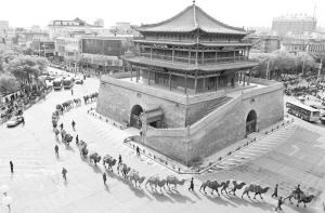 5月5日,由136峰駱駝組成的茶商駝隊從甘肅張掖鐘鼓樓前走過。