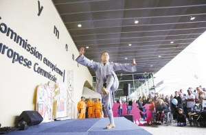 “中國(guó)角”首次現(xiàn)身歐盟開放日      5月9日,在比利時(shí)首都布魯塞爾歐盟委員會(huì)大樓下,中國(guó)武僧表演功夫。當(dāng)日是歐盟一年一度的開放日。因今年恰逢中歐建交40周年,中國(guó)成為歐盟成員國(guó)外唯一一個(gè)開設(shè)宣傳角的國(guó)家,也是1993年歐盟舉辦開放日以來中國(guó)首次參加,為今年的開放日增添了不少中國(guó)元素。新華社發(fā)